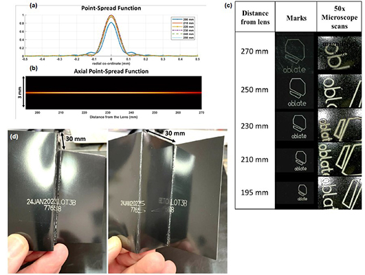 超长焦深(EDOF)平面透镜的性能如下图所示。在图 (a) 中,计算得出的点散射函数(PSF)显示了扩展焦深范围内的良好聚焦效果。计算出的 Point-spread function (PSF) 与镜头距离的函数关系也显示在图(b)中。图 (c) 右侧显示了距离镜头 195 - 270mm的标准黑卡标记测试以及标记的显微镜放大(50倍放大率)。目标距离发生变化时没有进行重新对焦。虽然由于工作距离的原因,标记的大小有所变化,但光斑的大小保持一致。在图(d)最下方的照片中,在一张折叠的卡片上进行了标准黑卡标记测试,卡片的两个表面相距30mm。两个表面上的标记都清晰明确。